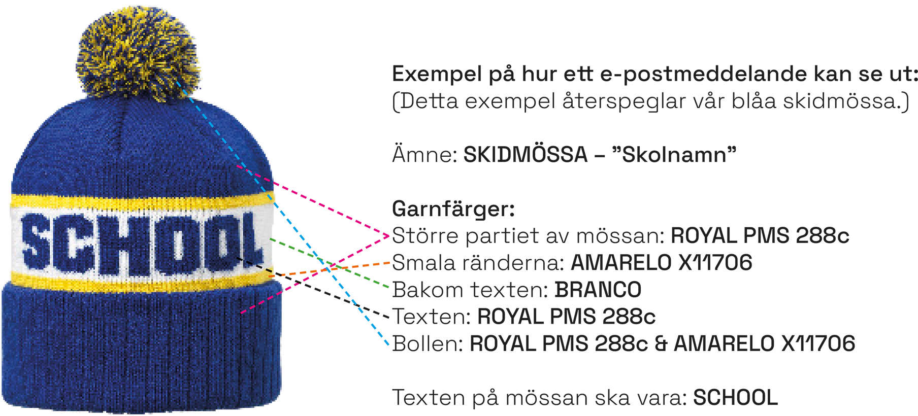 Vår skidmössa är en specialmössa, vilket betyder att den tillverkas utifrån order. Detta ger utöver färgvalen en möjlighet att lägga till en text som exempelvis skolnamnet. Vi välkomnar därmed speciella önskemål och hjälper dig gärna i processen. Påbörja din beställning för att tillsammans ta årets alla vinteraktiviteter och afterski-fester med stil.